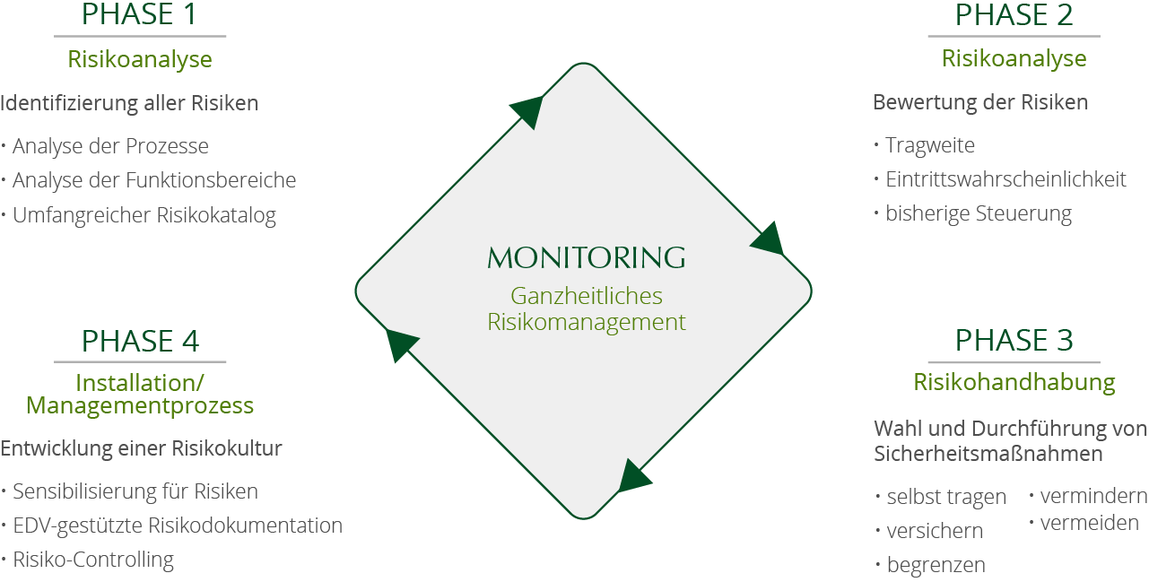 Ein ganzheitliches Risikomanagement bietet Transparenz über alle potenziellen Gefahren für das Unternehmen. Systematisch lassen sich die Risiken so gezielt steuern und verringern. Wir implementieren ein individuell abgestimmtes Risikomanagementsystem, mit dem Sie nicht nur Ihre Unternehmensrisiken minimieren, sondern auch Kosten reduzieren.